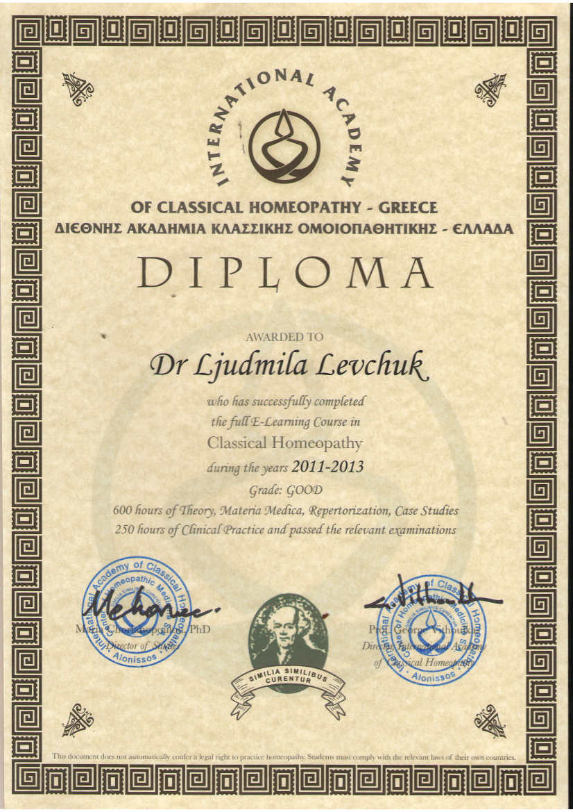 2011-2013г – повышение квалификации в Международной Академии Классической гомеопатии (проф. Дж. Витулкас).