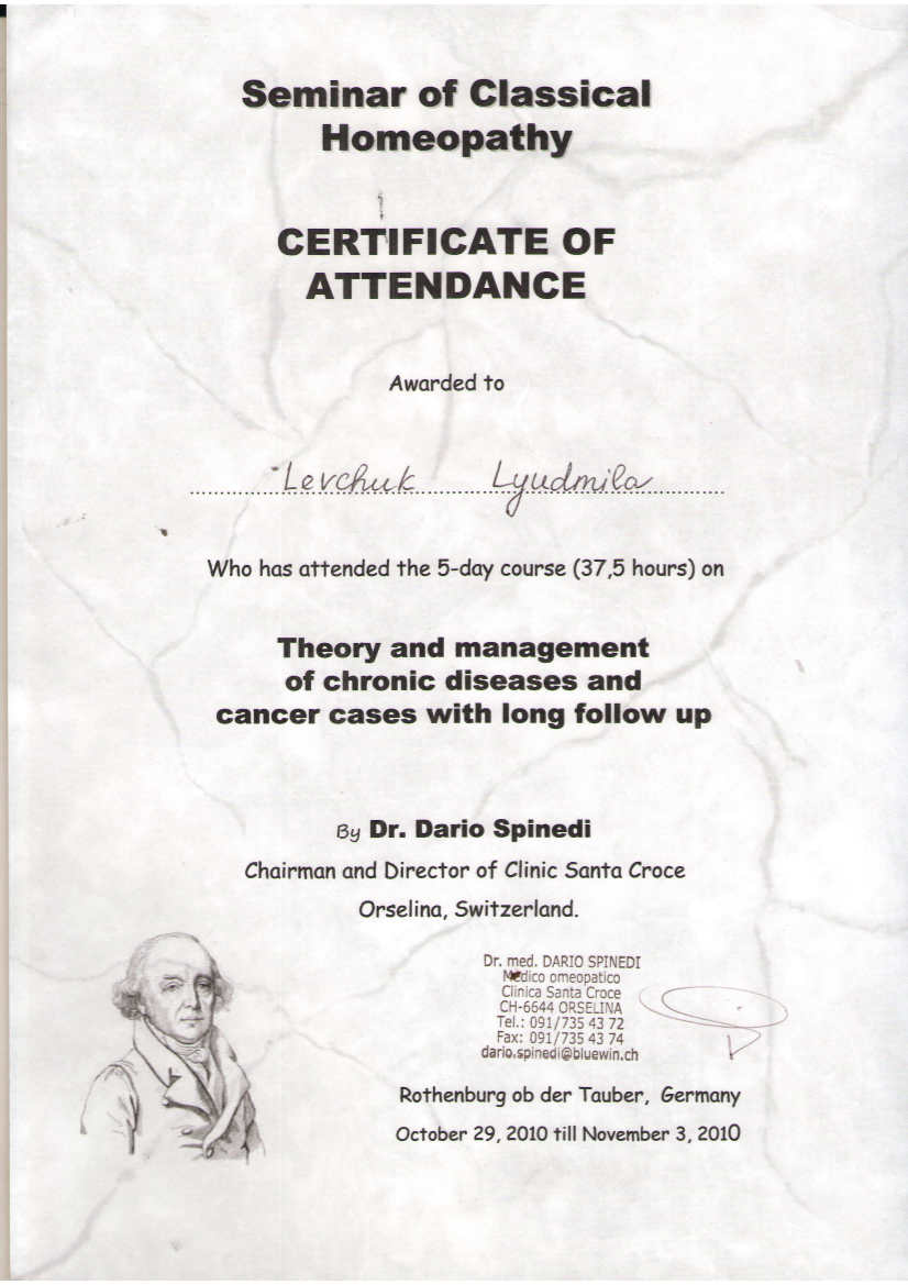 2008, 2010г – выездные семинары доктора Спиннеди (Швейцария) « Использование гомеопатии в лечении пациентов с онкологией»
